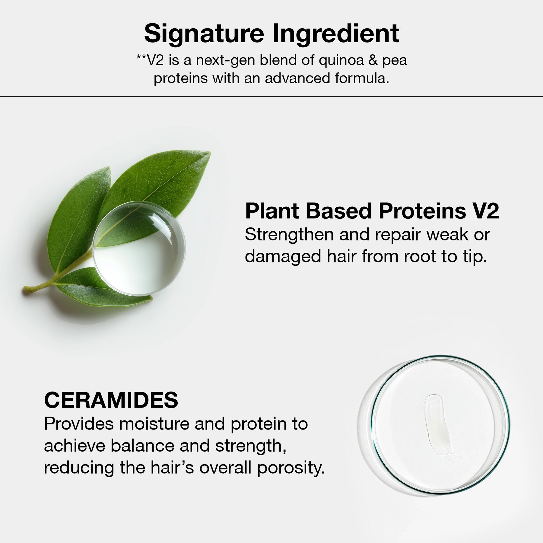 CERAMIDES: Provides moisture and protein to achieve balance and strength, reducing the hair’s overall porosity.